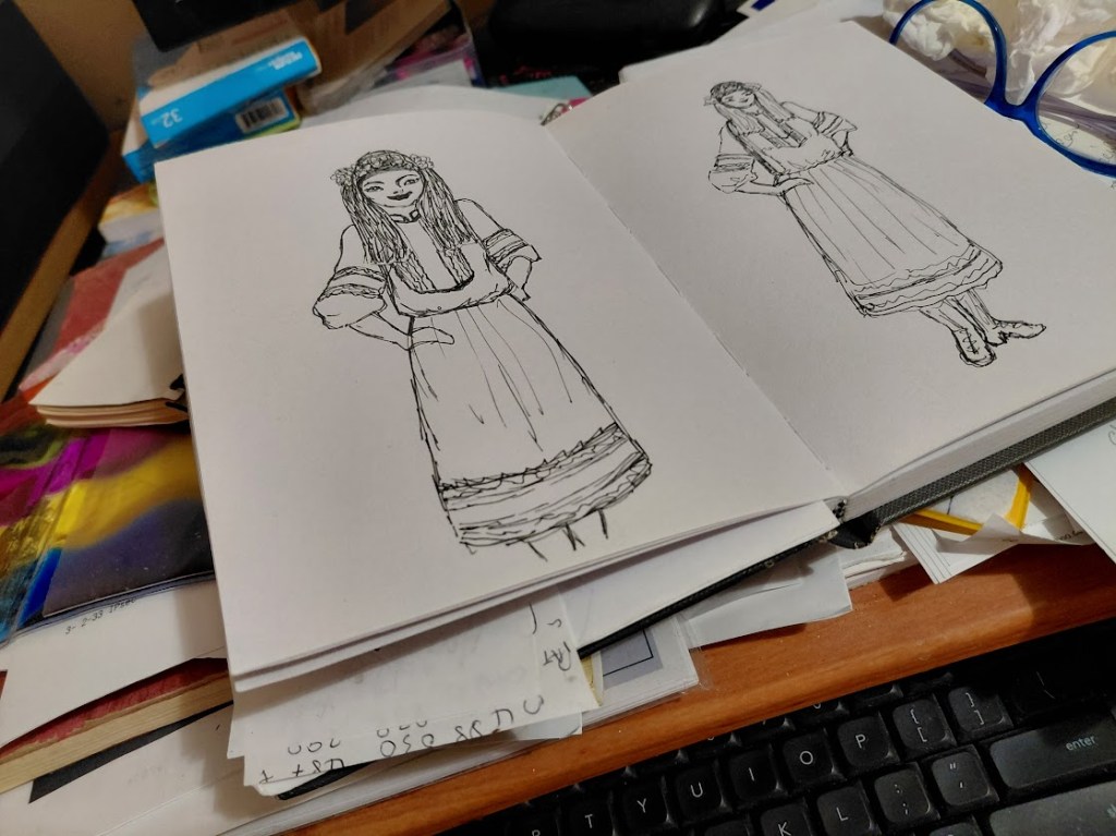 and yellow ribbons, embroidery on a blouse and woven sash