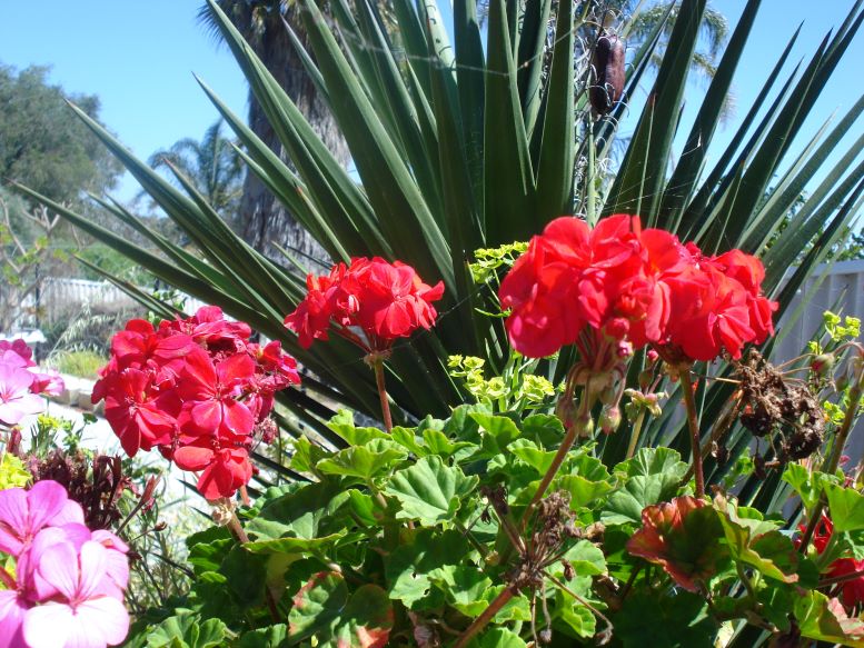 cerise Geraniums contained fields of unruly daisies white and purple self-seeding not needing input this house face lifted to halt age contemporised sold out and beige-d like every other me-erased