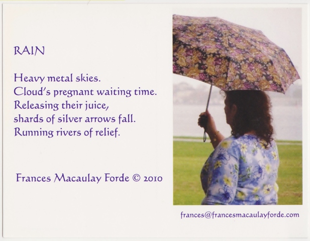 Posted in nature, Poetry, Poetry Postcards, Writing, tagged FrancesMacaulayForde, nature, PoetryPostcards, PP:Rain on December 11, 2014| 1 Comment »